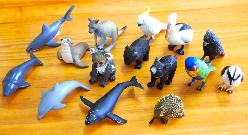 Set includes: Humpback Whale, Southern Right Whale, Dolphin, Shark, Sealion, Tasmanian Devil, Wombat, Koala, Kangaroo, Numbat, Pelican, Sulphur Crested Cockatoo, Black Cockatoo, Kookaburra and Rainbow Lorikeet.