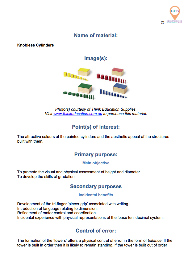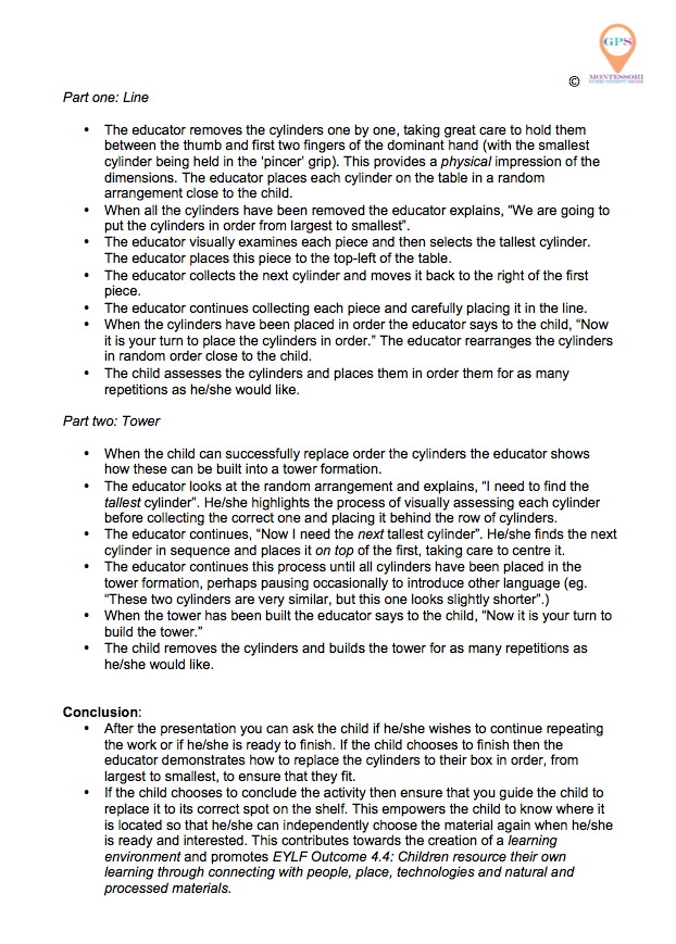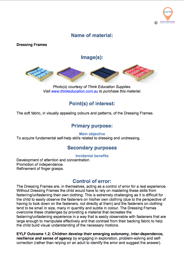 • Montessori GPS is a way to release Montessori educators from the burden of having to ‘reinvent the wheel’. Instead of each centre, or educator, having to cross-reference their Montessori program to the EYLF, or repeatedly explain materials to parents, the information is all contained in one convenient package.