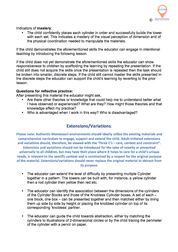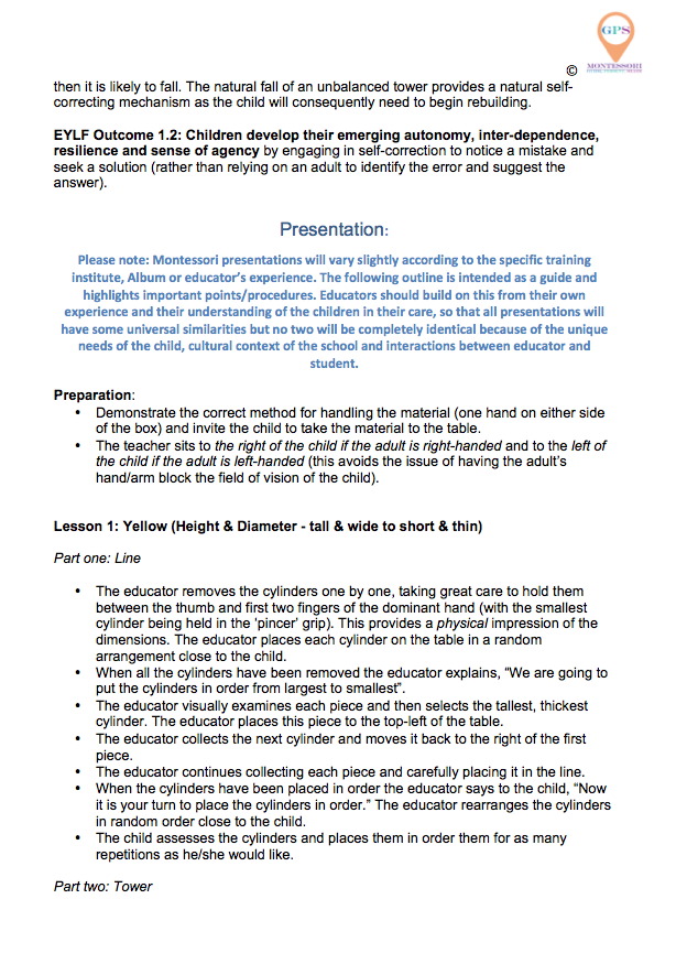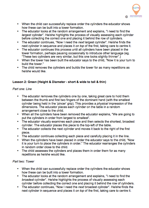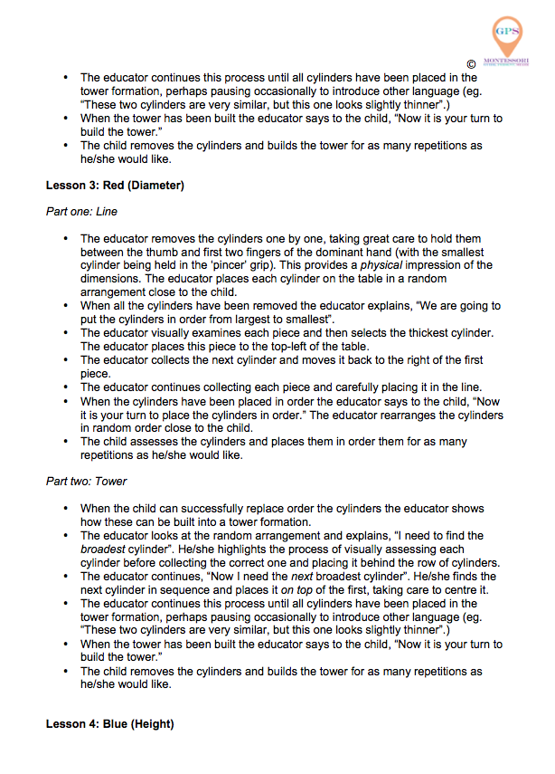 • These guides are not an attempt to comprehensively detail every single potential lesson in the Montessori curriculum. The full extent of the potential curriculum is simply too vast and detailed to cover in its entirety. Furthermore, each Montessori context is unique in terms of its character, its resources and its teaching team. As such, it is preferable for each school or centre to supplement Montessori GPS to reflect the materials, lessons, experiences and cultural considerations of their own unique situation.